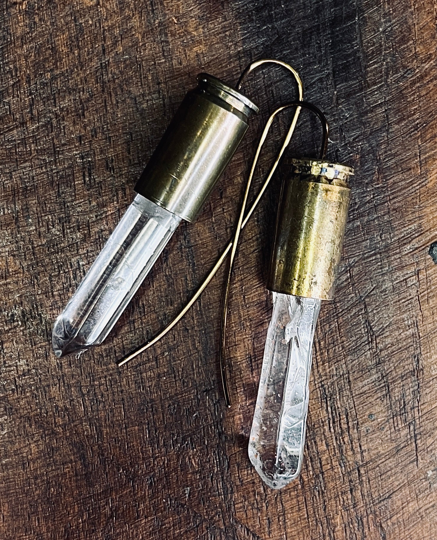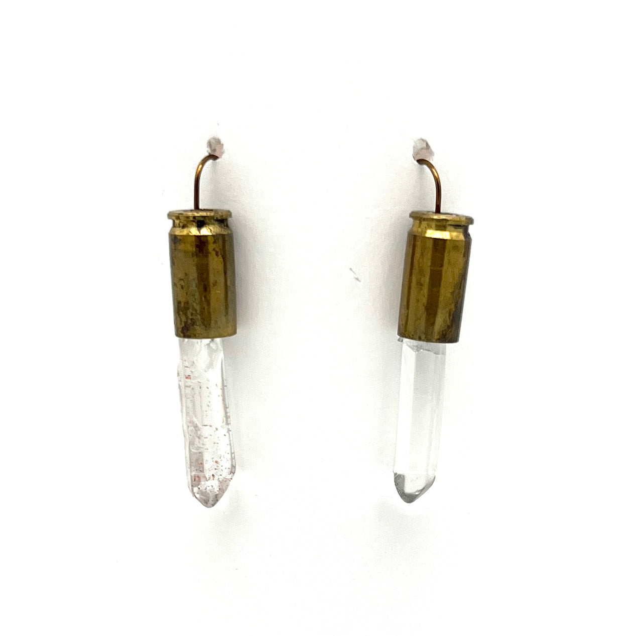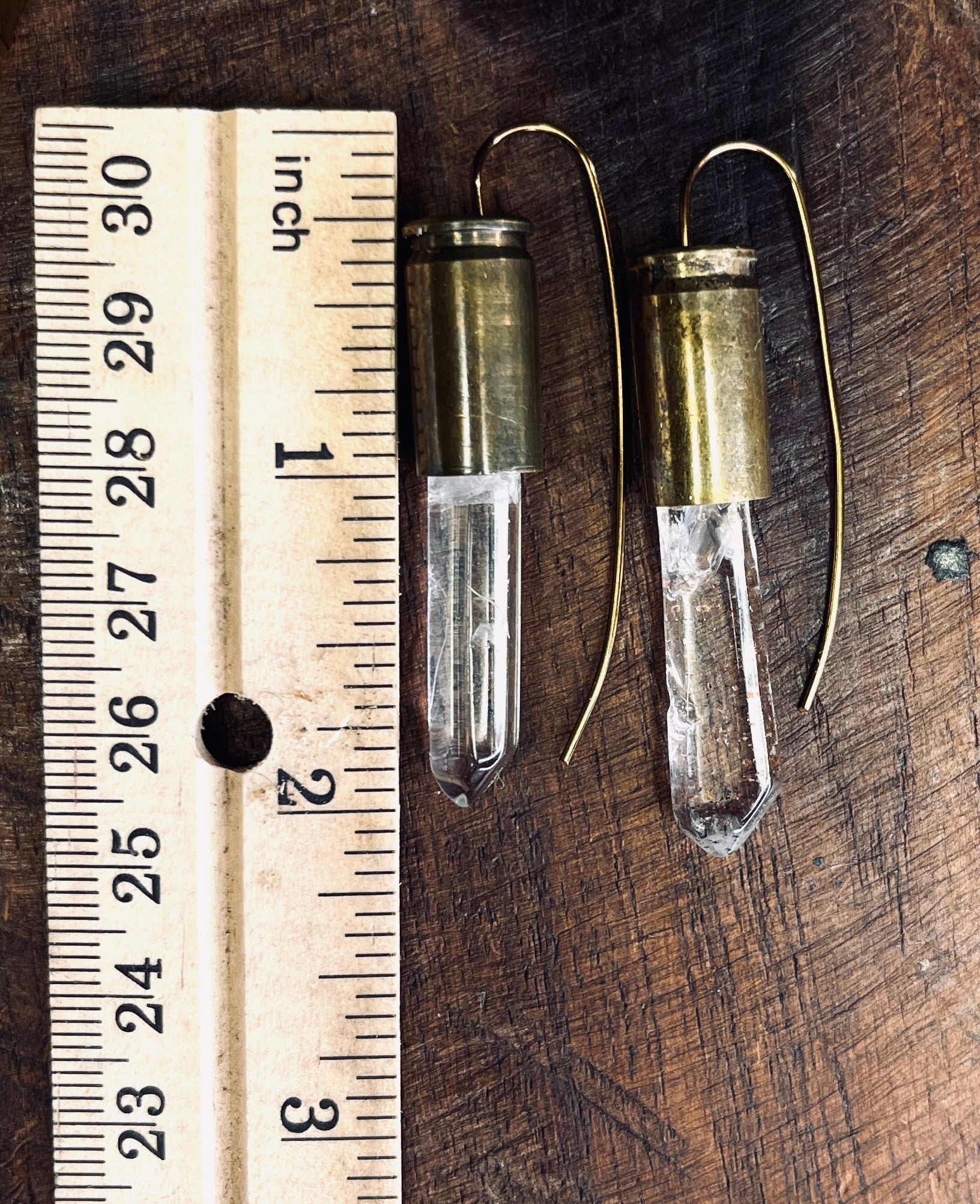 One-of-a-kind handcrafted earrings. Bullet Casing + Quartz Crystal. 2" dangle earrings.